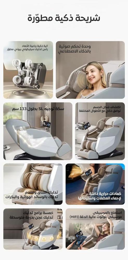 تم تزويد الكرسي بأحدث التقنيات المتطورة لعام 2026 مثل شاحن لاسلكي مدمج للهاتف، شاشة تحكم باللمس لسهولة الاستخدام، وحامل مخصص للجوال أو التابلت للاستمتاع بالمحتوى أثناء جلسة التدليك. كما يحتوي على لوحة تحكم جانبية مع مخرج USB لتوفير خيارات تحكم إضافية.